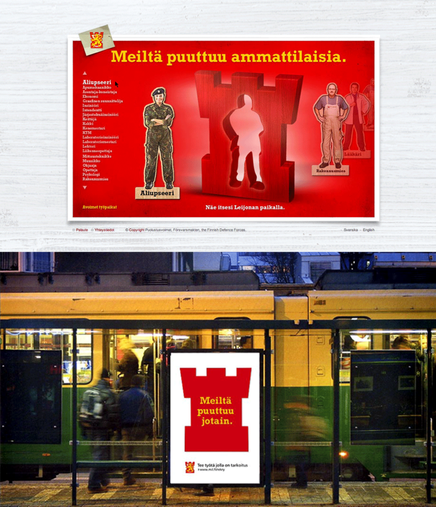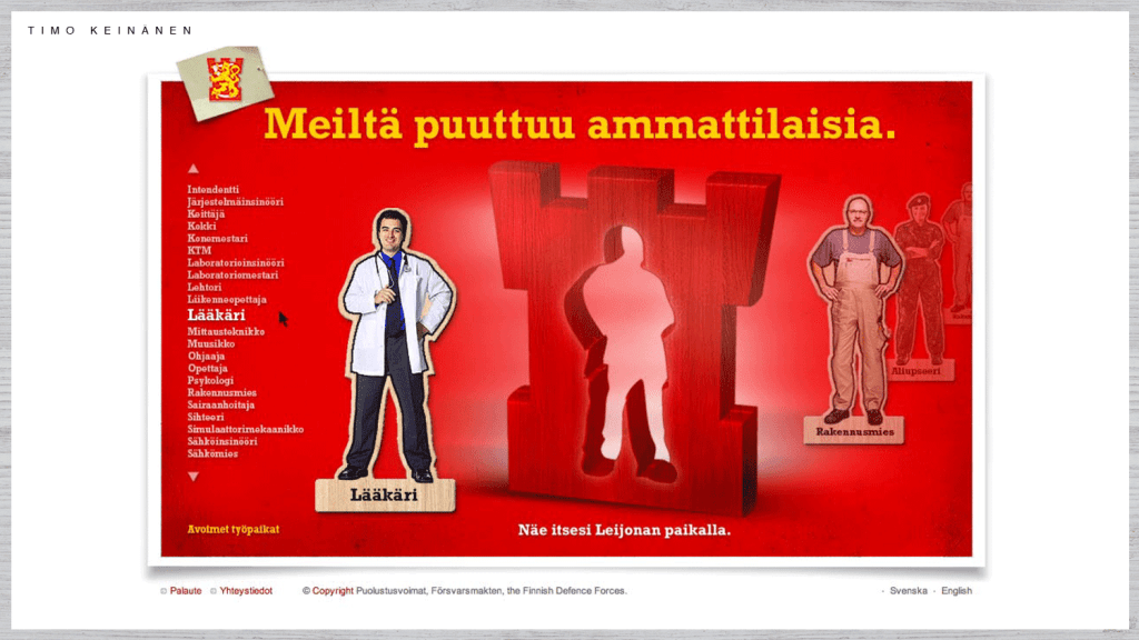 Recruit activities. Personnell recruitment campaign for other than military jobs. We designed the concept for a recruitment campaign online and print implementations targeting the civilian tasks of the army. There is a need of professionas for medical care, building and maintenance, machinery upkeep .. etc.