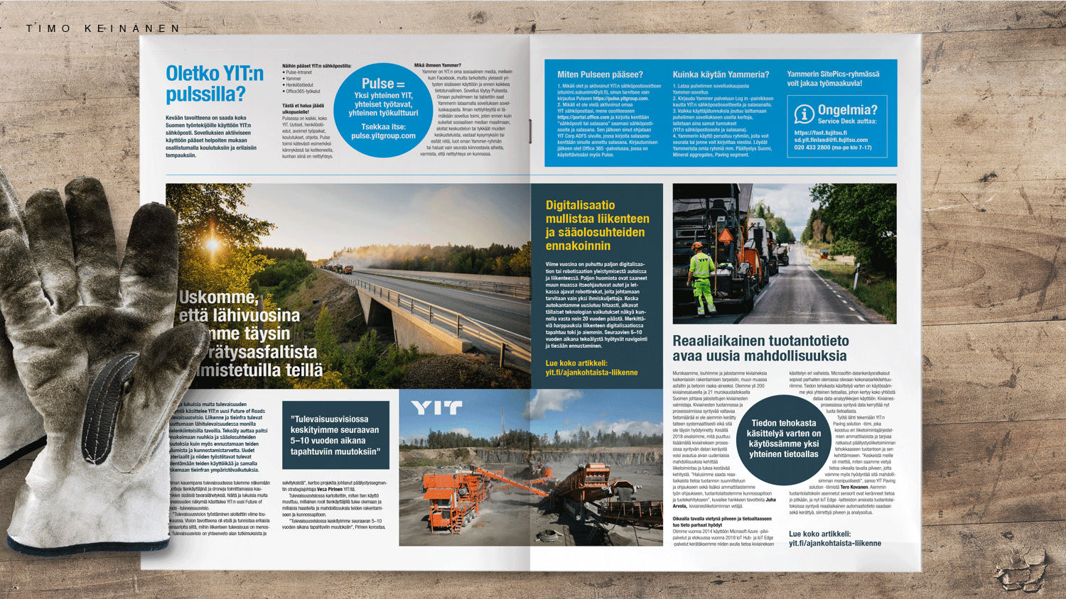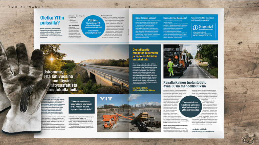 A communication concept and publications for seasonal workers. Paving work can only be done in the summer season. Round-the-clock days are a norm during the working season. And the winter season is spent away from Finland. In order to reach these professionals, we developed a communication concept and publication tools to approach permanent employees. That need to happen well in advance of the start of the season. Then it is assured that enough working staff is available when paving projects begin.