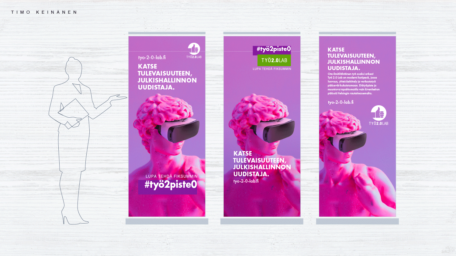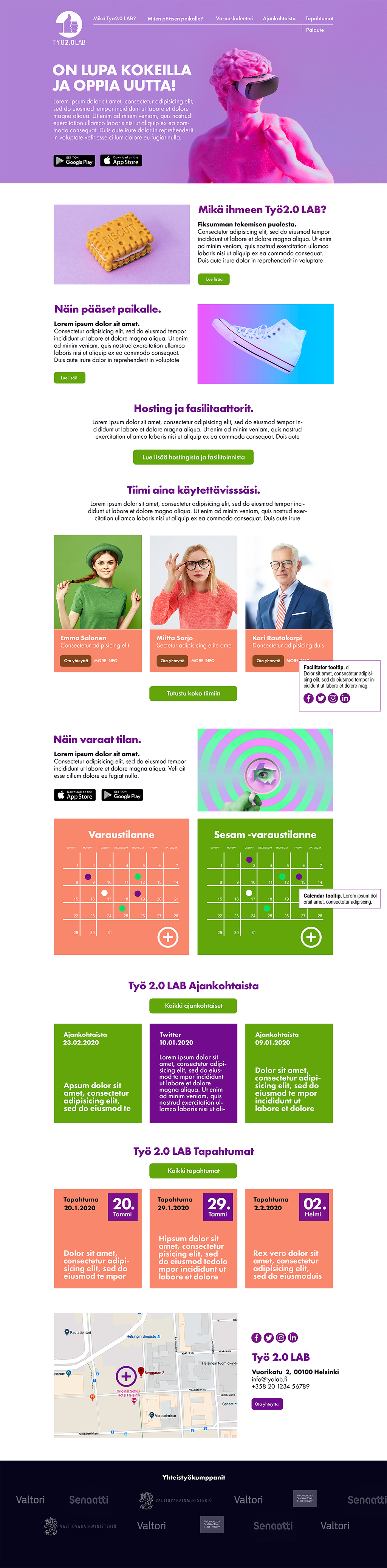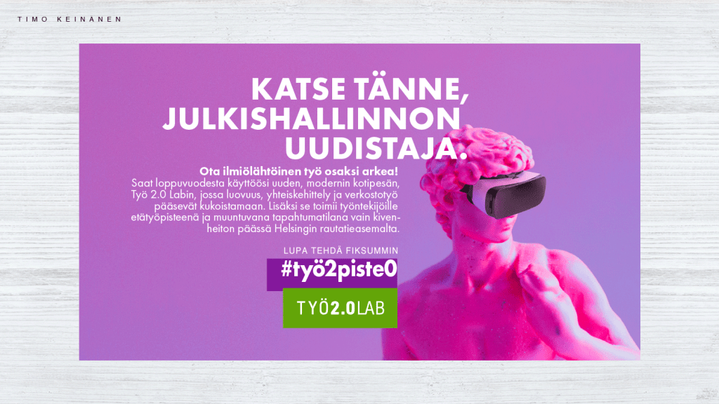 “Työ 2.0 Lab”. Joint workspace concept. Co-working space concept and location estates. “Työ 2.0 Lab” was born from a dream to do and learn things together. In other words to radicalize the rigid operating methods of public administration office and teamwork practices by making shared workspaces more widely available. “Työ 2.0 Lab” offers a meeting place and working facilities that crosses administrative and sector boundaries..