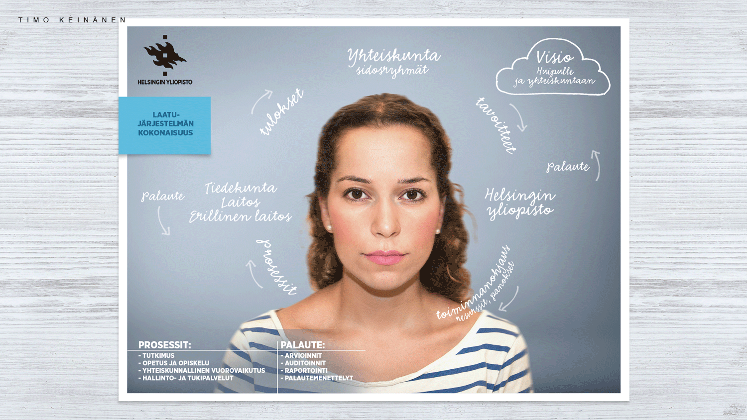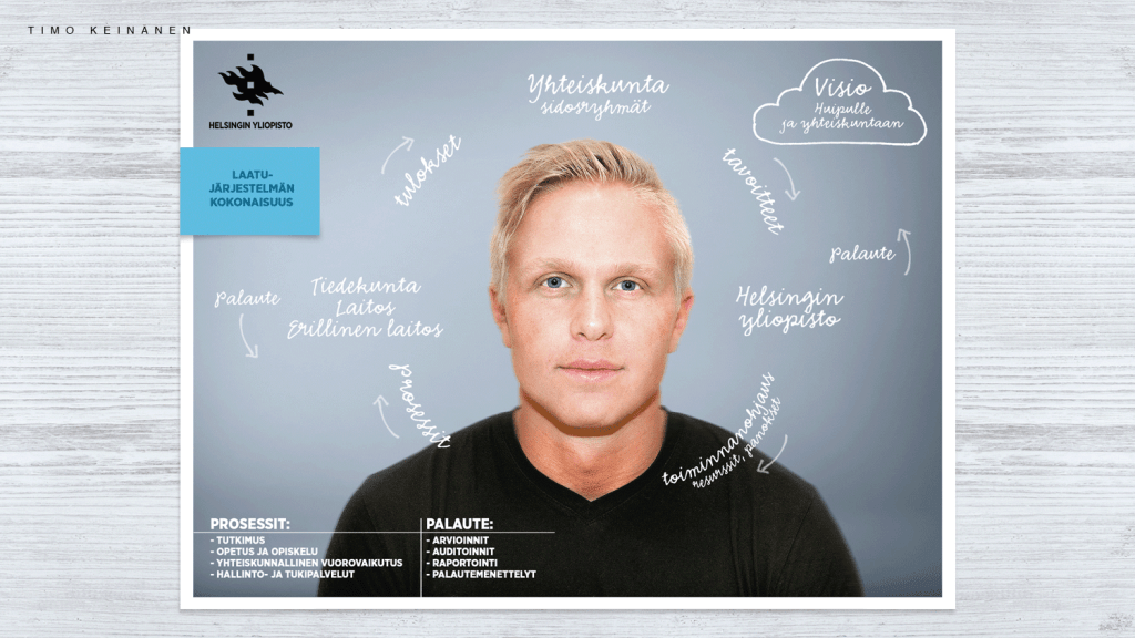 We also produced infographics for the basic strategy work to describe the relationship between the University’s strategy and vision. I worked on this visualization for a long time with the University’s communication team. At first we couldn’t find a suitable way to visualize the matter. Many different visual approaches were tried, until I suggested that we’ll build the most essential one – that is, the student – at the center of the visualization. That realization helped us to take the work further and into the finish.