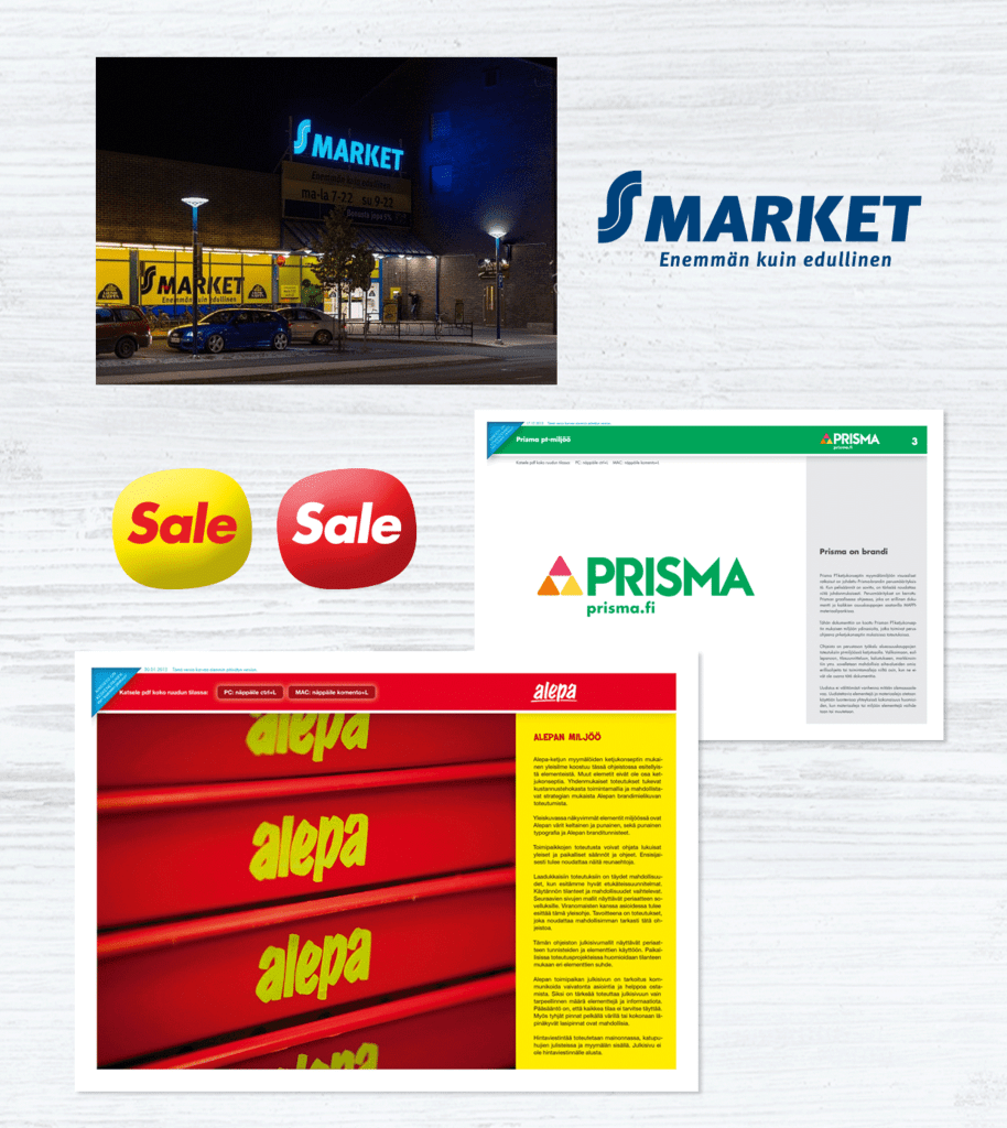 S-Group retail brands and stores. Retail brands ( S-Market, Prima, Alepa, Sale ) brand creation and design systems, retail stores milieu design remake, advertising concept update, and visual language and communication refreshment, customer communications service design.